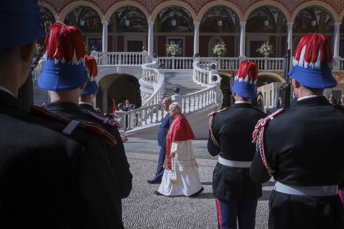 Встреченный князем Монако Альбером II и принцессой Шарлен, он направился от вертолётной площадки ко Дворцу. Во внутреннем дворе всё было выверено до мелочей: карабинеры, пожарные, оркестр — каждый элемент на своём месте. Папский марш зазвучал на фоне фасадов, затем прозвучал монегасский гимн, в то время как толпа, наблюдая за происходящим на экранах и в полной тишине, впитывала этот момент.